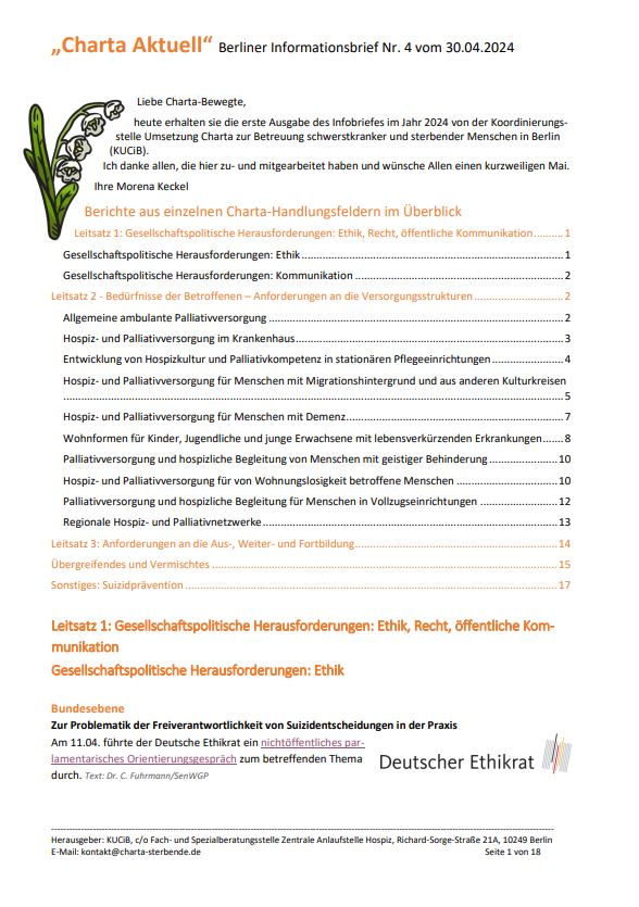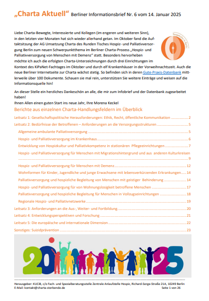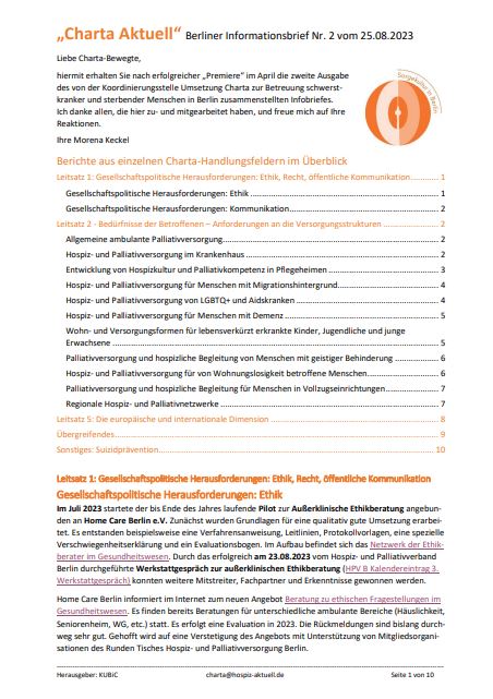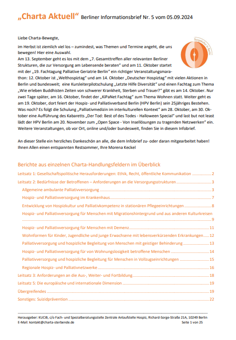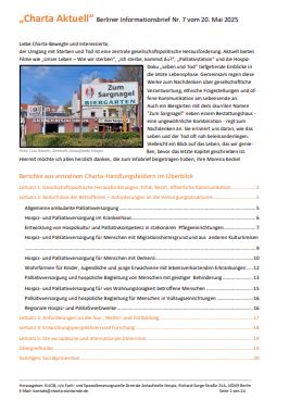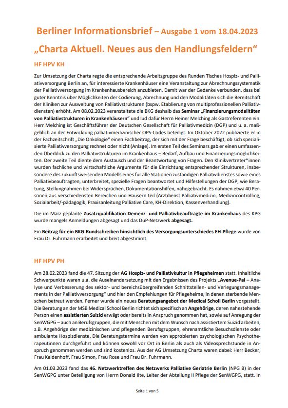Themen u.a. BürgerDialogForum, "Begleitung am Lebensende" in verschiedenen Sprachen, neue Handlungsfeld-Dokumentation HPV für Menschen mit Migrationshintergrund und aus anderen Kulturkreisen, 50.Sitzung der AG Umsetzung Charta