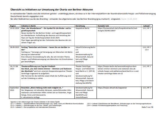 Damit die Charta nicht nur ein theoretisches Konstrukt bleibt, ist es wichtig, sie mit Leben zu füllen. Dies geschieht durch eine Vielzahl einzelner Initiativen und Maßnahmen, die sich stets auf die Umsetzung des großen Zieles beziehen: eine angemessene bzw. bessere Betreuung schwerstkranker und sterbender Menschen.