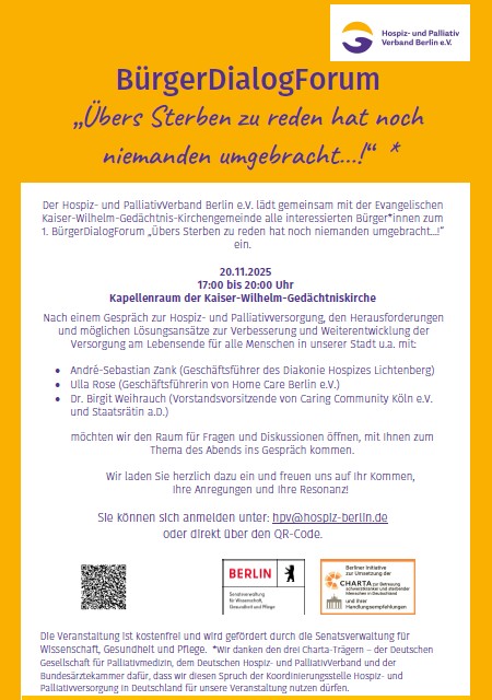 möchten wir den Raum für Fragen und Diskussionen öffnen, mit dem Publikum zum Thema des Abends ins Gespräch kommen. Das Gespräch über Sterben und Tod ist wichtig, weil es uns alle betrifft. Mit diesem Dialog wollen wir die Menschen in Berlin ermutigen, sich mit diesen grundlegenden Lebensthemen auseinanderzusetzen.