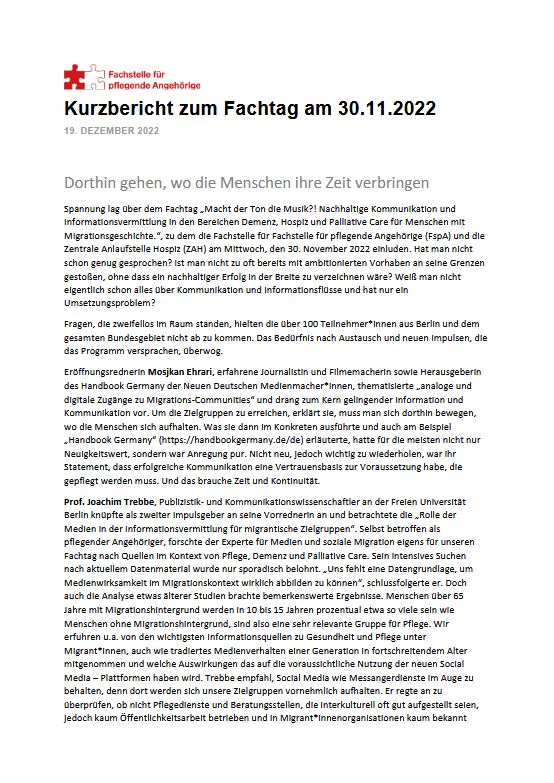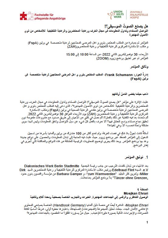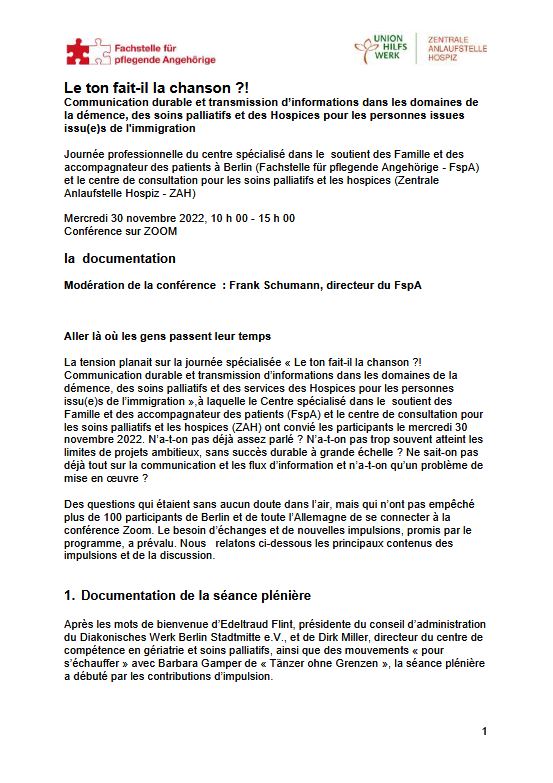 Die wesentlichen Inhalte unseres Fachtages „Macht der Ton die Musik?! Nachhaltige Kommunikation und Informationsvermittlung in den Bereichen Demenz, Hospiz und Palliative Care für Menschen mit Migrationsgeschichte“ vom 30.11.2022 wurden in sieben Sprachen übersetzt.