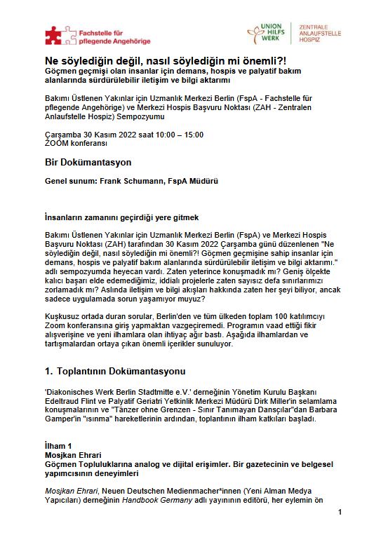 Göçmen geçmişi olan insanlar için demans, hospis ve palyatif bakım alanlarında sürdürülebilir iletişim ve bilgi aktarımı