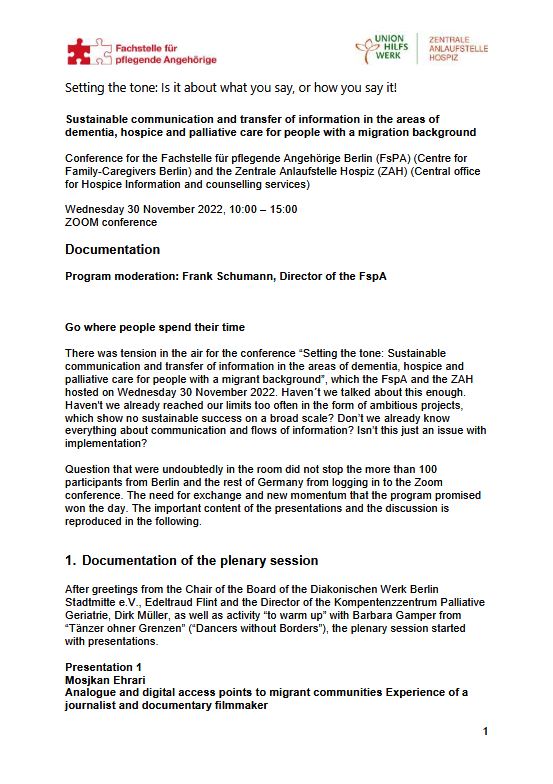Sustainable communication and transfer of information in the areas of dementia, hospice and palliative care for people with a migration background