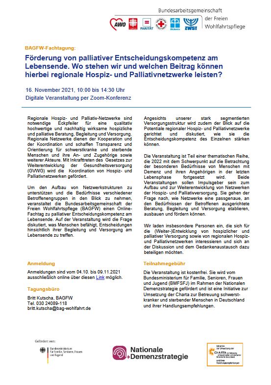 Die Veranstaltung ist Teil einer thematischen Reihe, die im ersten Quartal 2022 mit dem Schwerpunkt der besonderen Bedürfnisse von Menschen mit Demenz und ihren Angehörigen in der letzten Lebensphase fortgesetzt wird.
