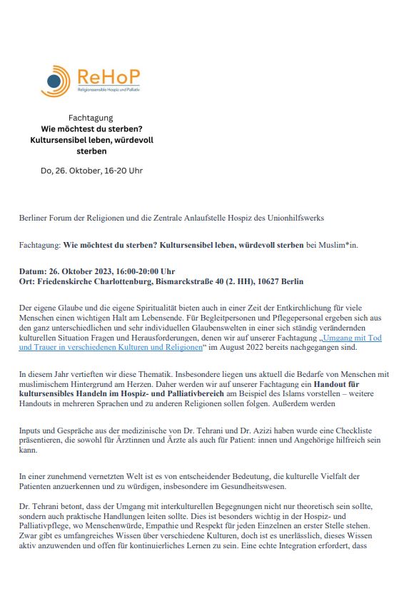 Groß war das Interesse an einem gelungenen kultursensiblem Umgang mit Patienten. Die Teilnehmer wünschten sich Einblicke in Bedarfe von Menschen mit muslimischem Kontext. „Diesen Wünschen gingen wir seitdem in unserer monatlichen Arbeitsgruppe nach. Auf unserer Fachtagung am 26. Oktober stellten wir nun in der Charlottenburger Friedenskirche unsere beiden Handreichungen vor und hoffen, dass sie viele wertvolle Begegnungen ermöglichen“, sagte Jala El Jazairi von der Zentralen Anlaufstelle Hospiz.
