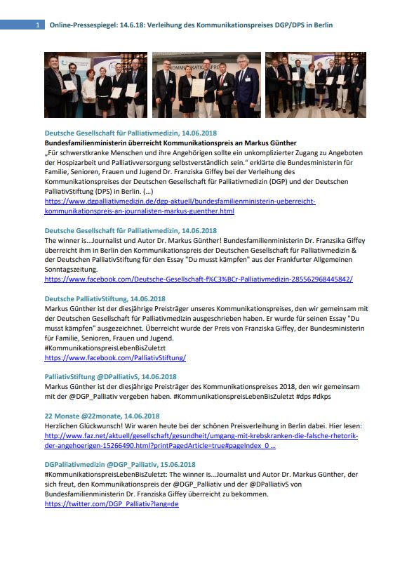 5seitiger Pressespiegel mit Artikeln und Links. Zur Verfügung gestellt von der Deutschen PalliativStiftung. Es gab insgesamt 35 Einreichungen für den Ausschreibung. Die Form der Beiträge war sehr vielfältig. Es gab Poster, Zeitungsbeiträge/ -beilagen, Broschüren, Bücher, Filme, Hörbeiträge uvm.