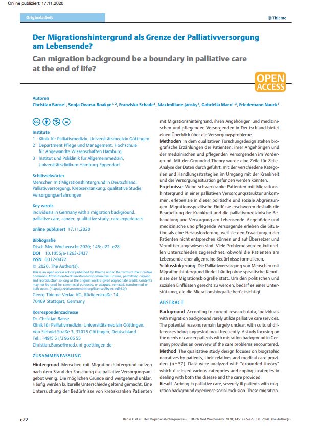 - Franziska Schade, Christian Banse, Nicola Rieder, Friedemann Nauck (Klinik für Palliativmedizin, Universitätsmedizin Göttingen)