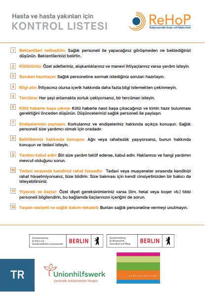 Checkliste für Patienten, An- und Zugehörige in türkischer Sprache.