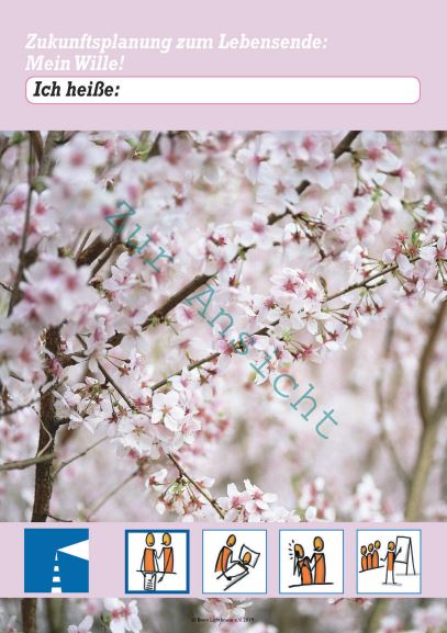 Zukunftsplanung zum Lebensende in leichter Sprache in der Fassung für Personen mittleren bis stärkeren kognitiven Beeinträchtigung (Hochformat). Das Dokument kann bei Bonn Lighthouse kostenpflichtig bestellt werden.