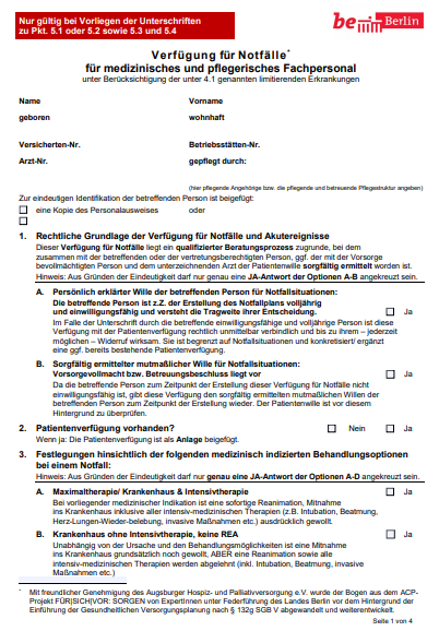 Verfügung für Notfälle für medizinisches und pflegerisches Fachpersonal