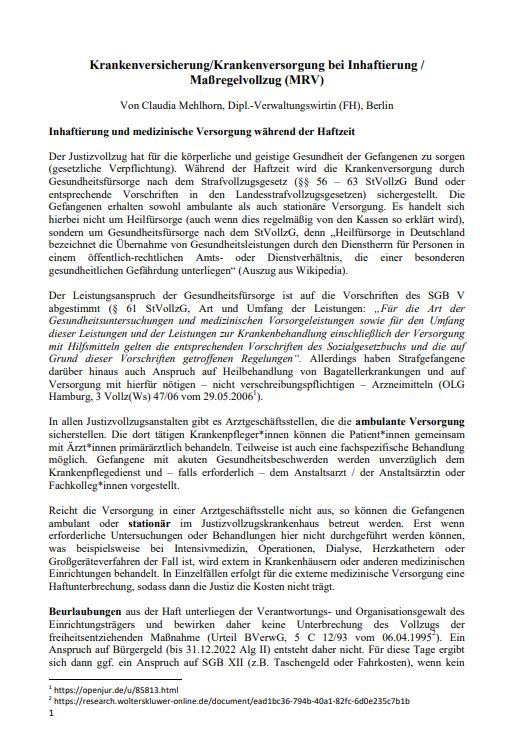 Fachaufsatz: Krankenversicherung / Krankenversorgung bei Inhaftierung / Maßregelvollzug (MRV)