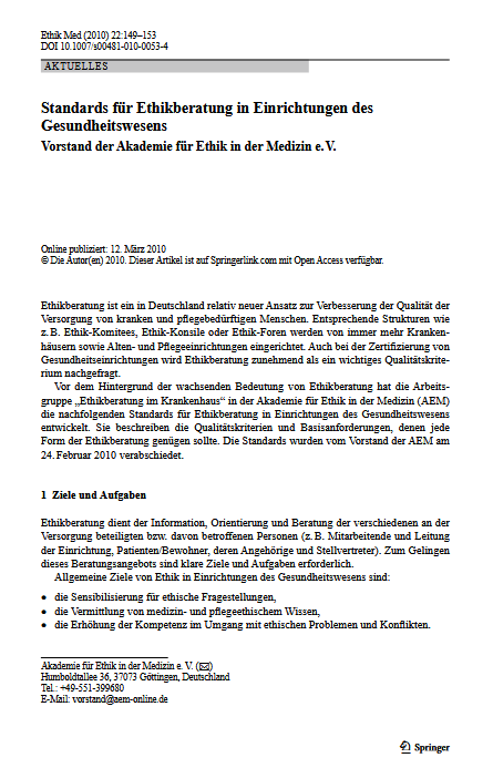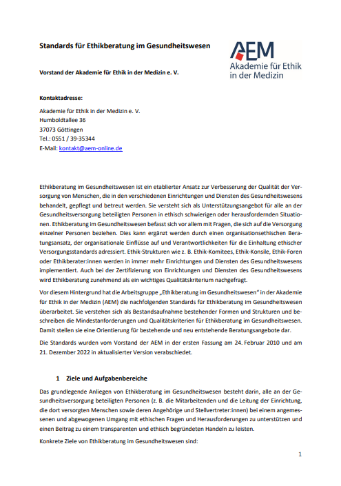 Vor dem Hintergrund der wachsenden Bedeutung von Ethikberatung hat die Arbeitsgruppe „Ethikberatung im Krankenhaus“ in der Akademie für Ethik in der Medizin (AEM) die Standards für Ethikberatung in Einrichtungen des Gesundheitswesens entwickelt.