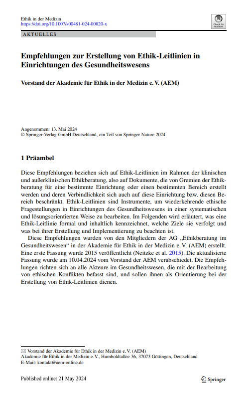 Vorstand der Akademie für Ethik in der Medizin e. V. (AEM) Diese Empfehlungen beziehen sich auf Ethik-Leitlinien im Rahmen der klinischen und außerklinischen Ethikberatung (...)