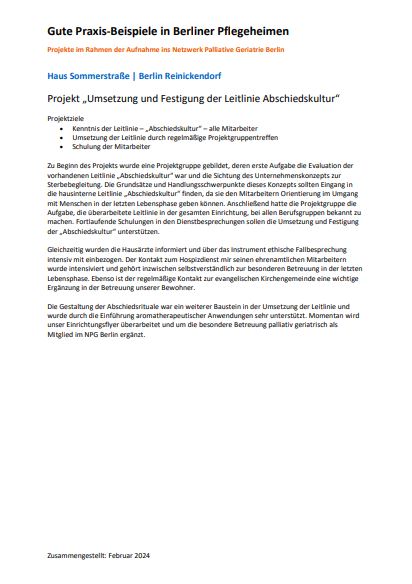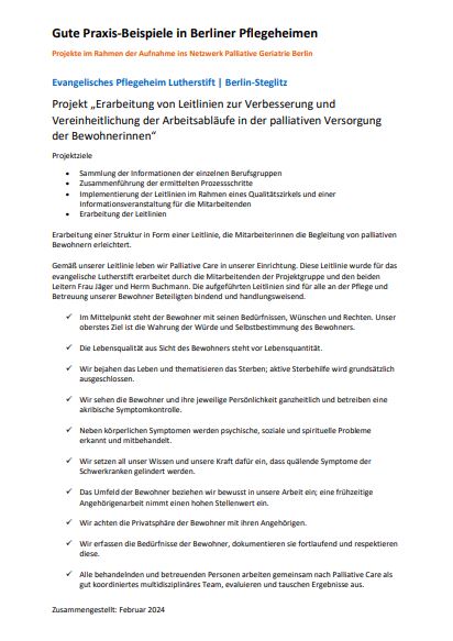 Projekt „Erarbeitung von Leitlinien zur Verbesserung und Vereinheitlichung der Arbeitsabläufe in der palliativen Versorgung der Bewohnerinnen“