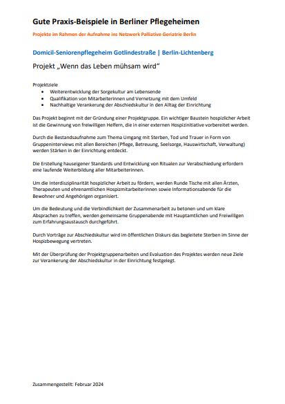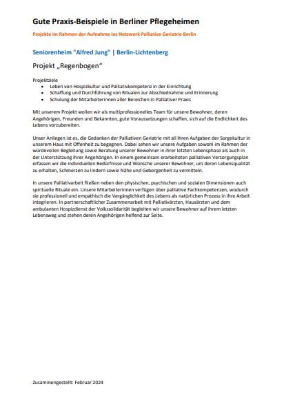 An dieser Stelle wollen wir Beispiele vorstellen, die zeigen, wie gute Begleitung am Lebensende, Begleitung ins Sterben, von Menschen verschiedener Zielgruppen gelingen kann. Alle vorgestellten Konzepte, Projekte oder Aktionen auf den unterschiedlichsten Ebenen sollen dazu dienen, sich an den Erfahrungen anderer zu orientieren. Sie sollen helfen, als „Gute Praxis“ Prozesse in der Begleitung sterbender Menschen zu optimieren oder Projekte zu palliativen Maßnahmen erfolgreich umzusetzen.