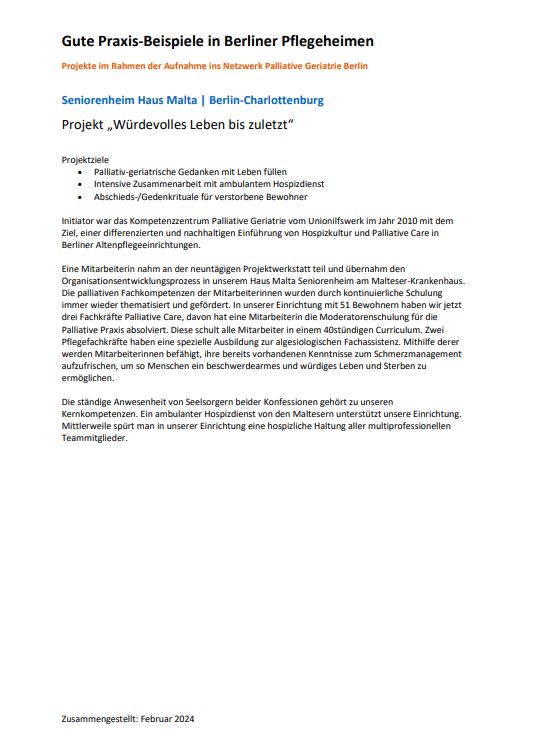 Initiator war das Kompetenzzentrum Palliative Geriatrie vom Unionilfswerk im Jahr 2010 mit dem Ziel, einer differenzierten und nachhaltigen Einführung von Hospizkultur und Palliative Care in Berliner Altenpflegeeinrichtungen.