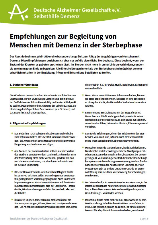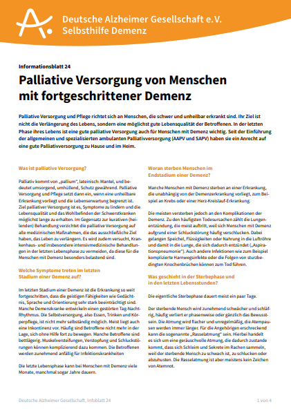 Für Menschen mit Demenz in ihrer besonderen Situation und Verletzlichkeit ist eine gute und verlässliche palliativgeriatrische Versorgung in der letzten Phase ihres Lebens von großer Bedeutung – besonders, wenn die Erkrankung so weit fortgeschritten ist, dass geistige Fähigkeiten wie Gedächtnis, Aufmerksamkeit, sprachlicher Ausdruck und Sprachverständnis, Orientierung und Denkvermögen sehr stark beeinträchtigt sind.