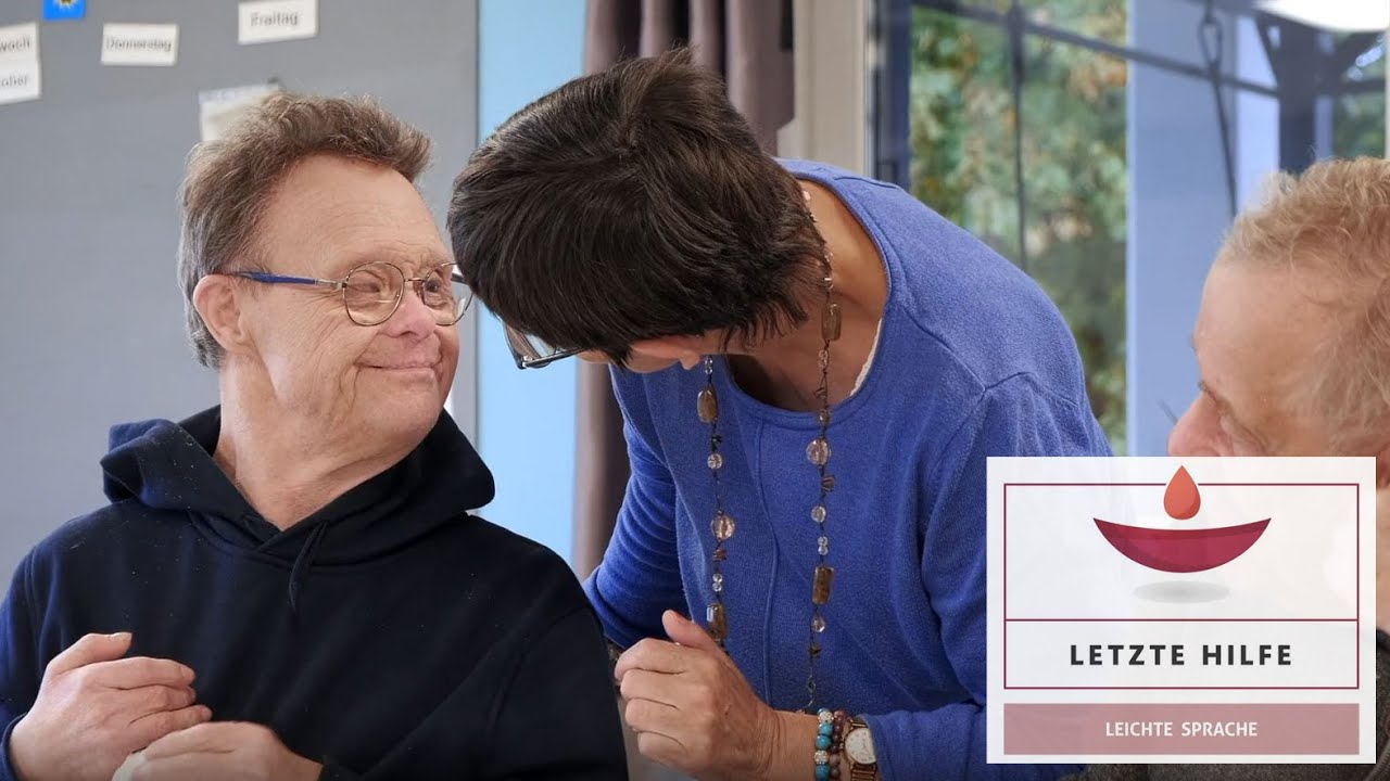 Auch für Menschen mit Behinderung kann ein Kurs zur Letzten Hilfe sinnvoll und wichtig sein. Wie auch schon beim Angebot der Gesundheitlichen Versorgungsplanung für die letzte Lebensphase (GVP) wollen sie über Entscheidungen zu ihrem Lebensende selber treffen, diesbezüglich einbezogen sein oder auch in einem entsprechenden Kurs etwas darüber erfahren. Ein Letzte-Hilfe-Kurs kann da eine gute Möglichkeit sein, an das Thema heranzuführen und über das Sterben und den Tod zu sprechen. Dies sollte aber idealerweise niedrigschwellig und leicht verständlich, in Leichter Sprache, erfolgen. Ein gutes Beispiel dafür zeigt das Video aus einer Senioren-Tageseinrichtung für Menschen mit Behinderungen.