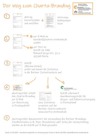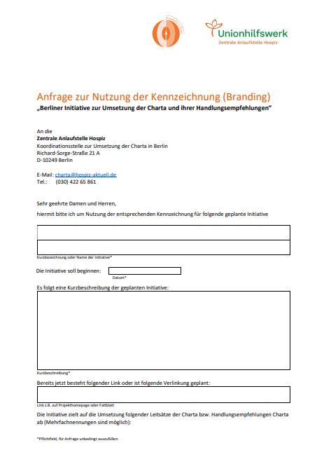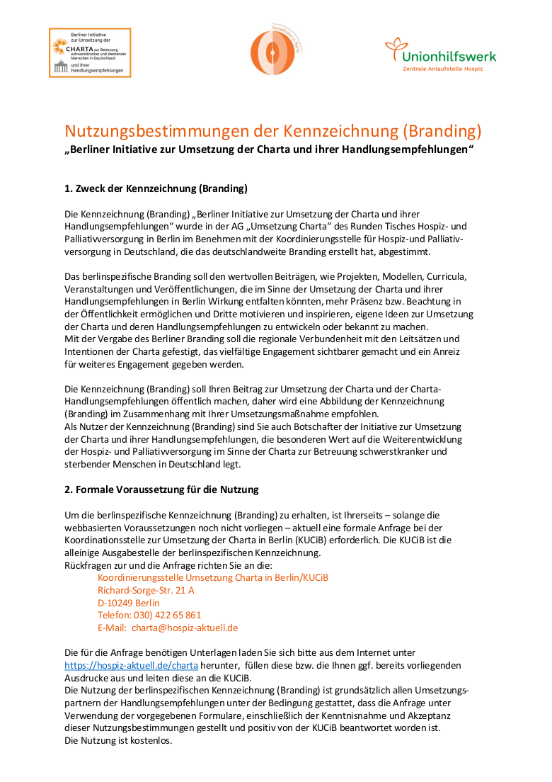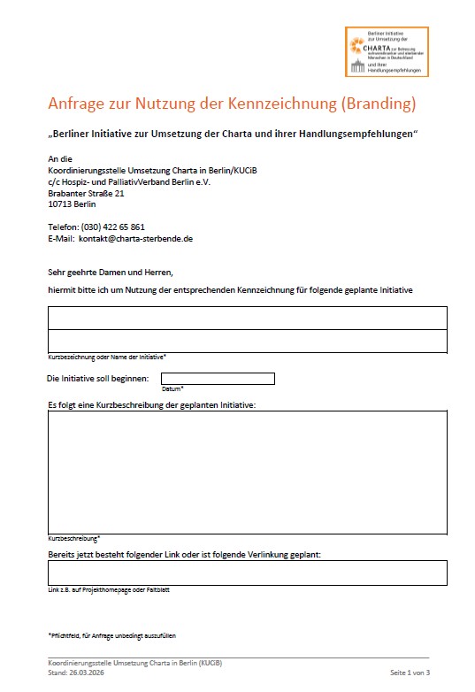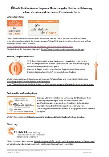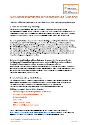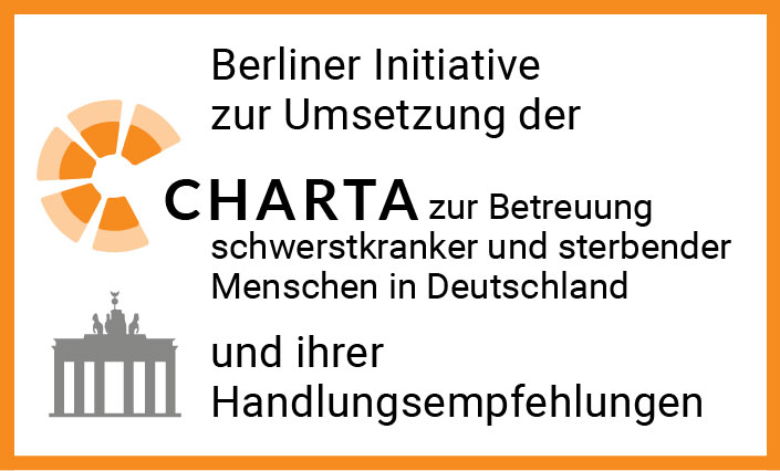 Die Kennzeichnung (Branding) „Berliner Initiative zur Umsetzung der Charta und ihrer Handlungsempfehlungen“ wurde in der AG „Umsetzung Charta“ des Runden Tisches Hospiz- und Palliativversorgung in Berlin im Benehmen mit der Koordinierungsstelle für Hospiz-und Palliativversorgung in Deutschland, die das deutschlandweite Branding erstellt hat, abgestimmt. Das berlinspezifische Branding soll den wertvollen Beiträgen, wie Projekten, Modellen, Curricula, Veranstaltungen und Veröffentlichungen, die im Sinne der Umsetzung der Charta und ihrer Handlungsempfehlungen in Berlin Wirkung entfalten könnten, mehr Präsenz bzw. Beachtung in der Öffentlichkeit ermöglichen und Dritte motivieren und inspirieren, eigene Ideen zur Umsetzung der Charta und deren Handlungsempfehlungen zu entwickeln oder bekannt zu machen.